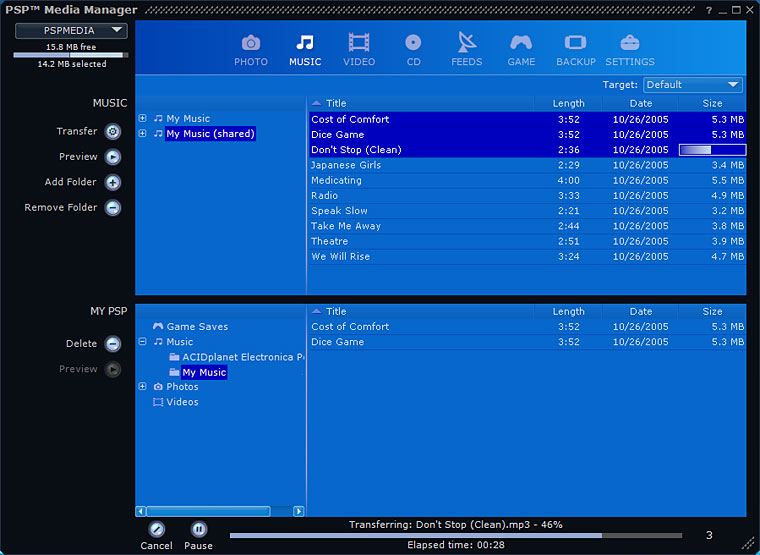 In particular, transferring videos can be a pain as you have to create the folder to hold the video in the correct place on the memory stick and use the correct folder naming format. If not, the PSP simply won’t be able to find your videos. In addition the video also has to be in the correct format (i.e. not avi/mpg/ogg). The media manager simplifies this process allowing you to drag and drop files from your PC to your PSP and re-encodes them (where necessary) so that they are always in the correct format for PSP usage