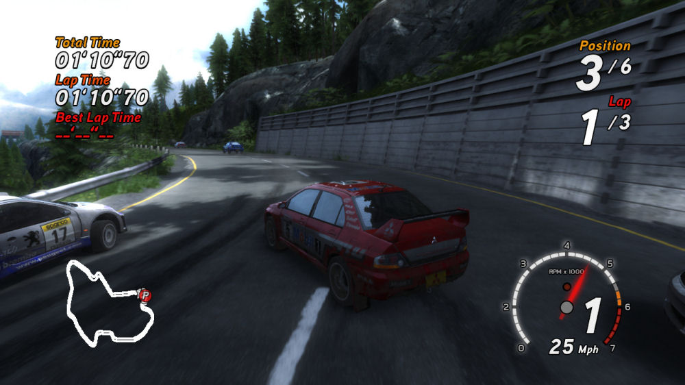 This was a highly-unfashionable decision, judging by most recent racing games, but I think it was reasonable. Contending with the churned-up track is probably enough challenge without having to drive with broken front suspension as well. For any mud-lovers reading, if you drive through lots of muddy areas, your car will get progressively muddier and, get this… feature at least three different shades of caked mud!! Um… yeah. Okay. You can sort of wash it off in the puddles, too. They made it happen right there before our eyes. - Sixaxis tilt control will (probably) be used: