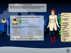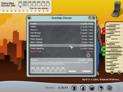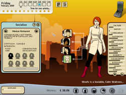 That’s not to say that it’s just for maths fans. I know I play a lot of RPGs but I couldn’t care less about numbers. I’m in it to build characters – Kudos 2 lets you do that too. There’s a good range of options for everything – after work you can hang out with a huge range of people, each with their own likes and dislikes. You can go bowling (increase your fitness and fun) or go to the opera (take in some culture) or just out for fried chicken (build up that flab!) and grow or lose your friendships along the way. If you don’t like feeling sociable, you can take evening classes to further your career or just read a good book.