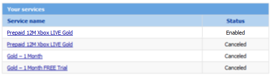 Going to the Payment method information page as instructed brings me to my Microsoft billing information. This reveals that my only existing service is “Prepaid 12M Xbox Gold”.