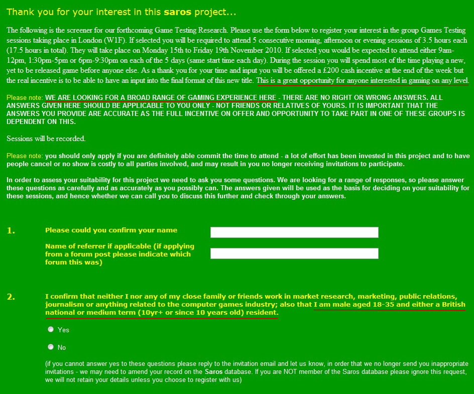 “I confirm that neither I nor any of my close family or friends work in market research, marketing, public relations, journalism or anything related to the computer games industry; also that I am male aged 18-35 and either a British national or medium term (10yr+ or since 10 years old) resident. Yes/No”