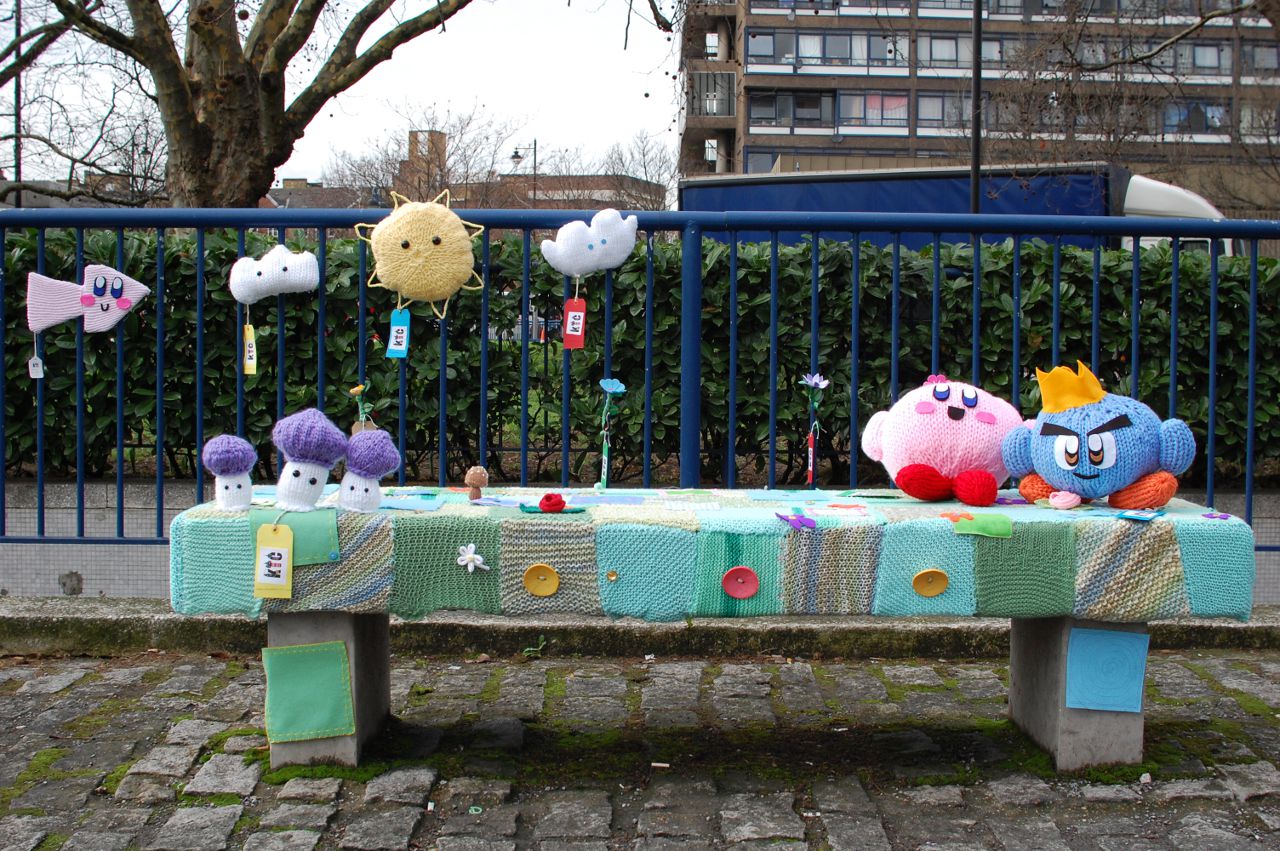 Commissioned by Nintendo to herald the launch of the impossibly cute Kirby’s Epic Yarn, Knit The City had created a whole array of characters from the game. They had transformed a previously drab and dull bench located in the middle of a very busy roundabout, into something straight out of the game. Kirby and Prince Fluff were sitting proudly on top of this throw surrounded by clouds, flowers, the sun and some mushrooms. It was all quite impressive and so very soft :-)