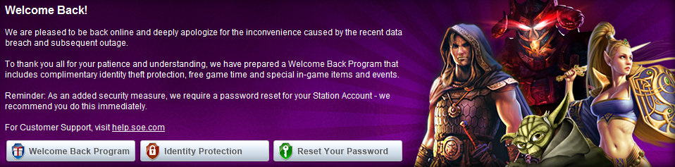 Sony Online Entertainment (SOE) have been sending out emails inviting registered customers to change their account passwords as well as detailing the welcome back and identity protection programs. The identity protection program information also applies to PlayStation Network/Qriocity account holders.
