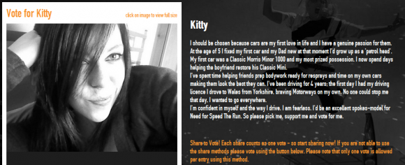 On top of the popularity component, the top twenty entrants will be tested on their NFS gaming skills and their real-life driving ability. Athough the two knowledge questions in the form feel like a token effort, EA are making sure that these “spokemodels” are more than hired booth babes – hopefully even true car lovers who enjoy racing games. Use of the word “spokesmodel” does make it clear that physical appearance will be a factor. However, it’s not the be all and end all of the decision-making process and that’s really all we can ask from a marketing effort. If you want a professional marketer’s take on this, check out Joe Dale’s feature on Death by Robots.