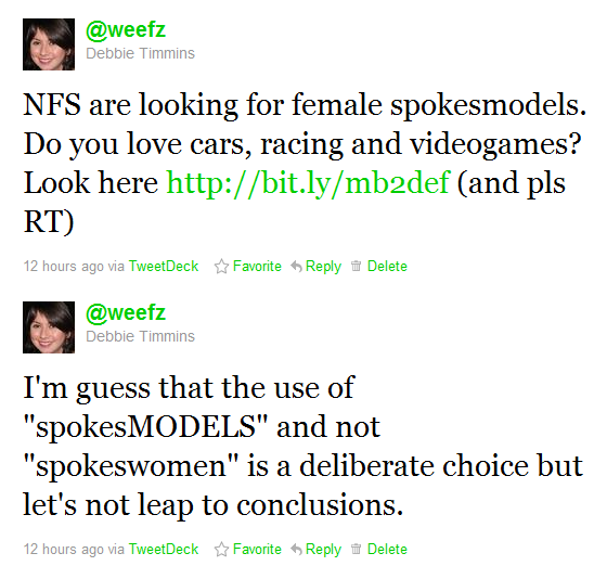 ![NFSTwitterResponse Two tweets in successtion: "NFS are looking for female spokesmodels. Do you love cars, racing and videogames? Look here [link] (and pls RT)" and "I'm guess that the use of "spokesMODELS" and not "spokeswomen" is a deliberate choice but let's not leap to conclusions."](http://www.theaveragegamer.com/wp-content/uploads/2011/07/NFSTwitterResponse.png)