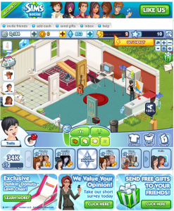 At heart, it”s The Sims but faster. You have the classic meters that go down over time: social, fun, food, bladder, hygiene and sleep. These decline over time and you only need to perform four of the appropriate action to fill up the meter. Make Sim friends with your Facebook friends and pootle about little house and gain simoleons to buy new furniture, build new rooms and so on. Click on an object to bring up a radial menu, choose what you want to do. Practice skills like writing and cooking to level up and visit other people”s houses to improve your friendship. Same old, same old, right?