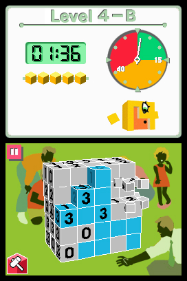 The player is given a grid – or in Picross 3D, a collection of cubes forming a 3D shape – with number clues on it. The clues tell the player which of grid-squares/cubes are part of an object contained in the puzzle, and which can be chipped away.