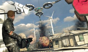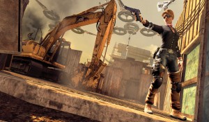 I played a short session on one of the maps and you can really see the entertainment factor built into the environment. Giant holographic versions of high-scoring players tower over the open roofs of a container store and flying camera drones follow the action from above. Disappointingly, shooting the cameras has no effect on your heat and they take no damage.