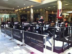 To find out who can set the fastest lap, Race Room have set up 10 race pods in Jubilee Place, Canary Wharf. The pods are all linked together so you”ll be racing on the Brands Hatch circuit in Formula 1 cars with 9 other drivers. You get 2 warm-up laps and then 3 race laps to set your fastest time. The simulator software is rFactor Pro which, as it”s not available to download for home use, goes some way to levelling the playing field against those racing sim petrol heads.