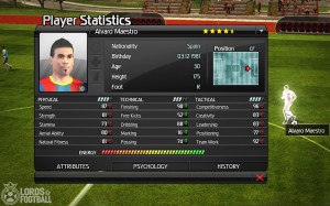 You can have up to 30 players in your club. Each player has two(-ish) sets of stats: the classic footballing stats like dribbling, free kicks, positioning and so on; and the Sims-like personality stats – current mood, training condition, alcohol addiction and more.