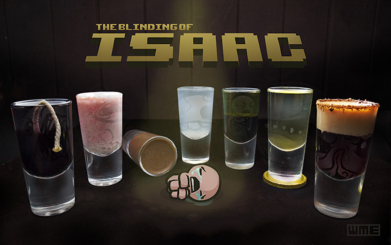I tried his cocktails at the ExPlay Festival last year and they are, indeed, fabulous. Dance and his photographer Will Edgecombe have an excellent sense of style and are great at working with a theme. Here’s a cocktail set inspired by indie roguelike game, The Binding of Isaac. You can find details of each shot over on The Drunken Moogle: