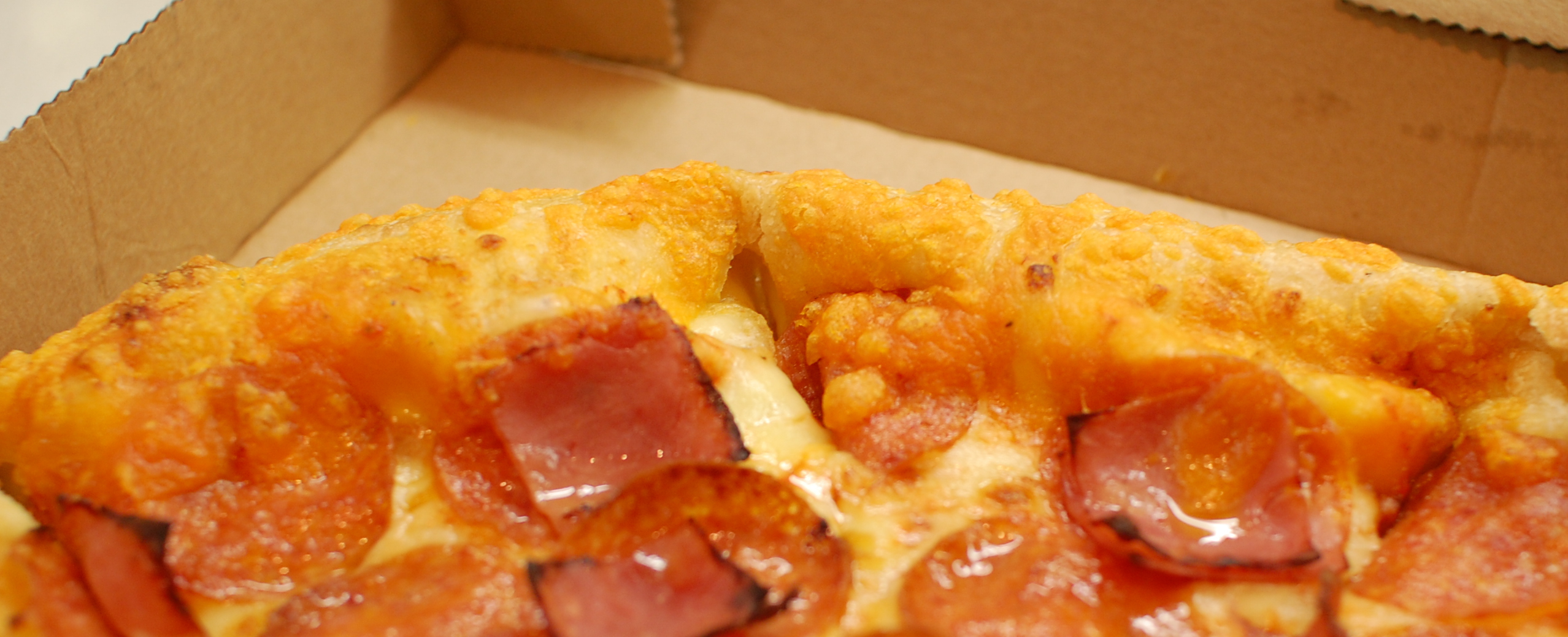 Mmm, look at that bad boy. Go on. Look at the Red Leicester Halo. Look at the grease shimmering on the ham. Look at the lumps of congealed mozzarella, slathered all over the doughy base.