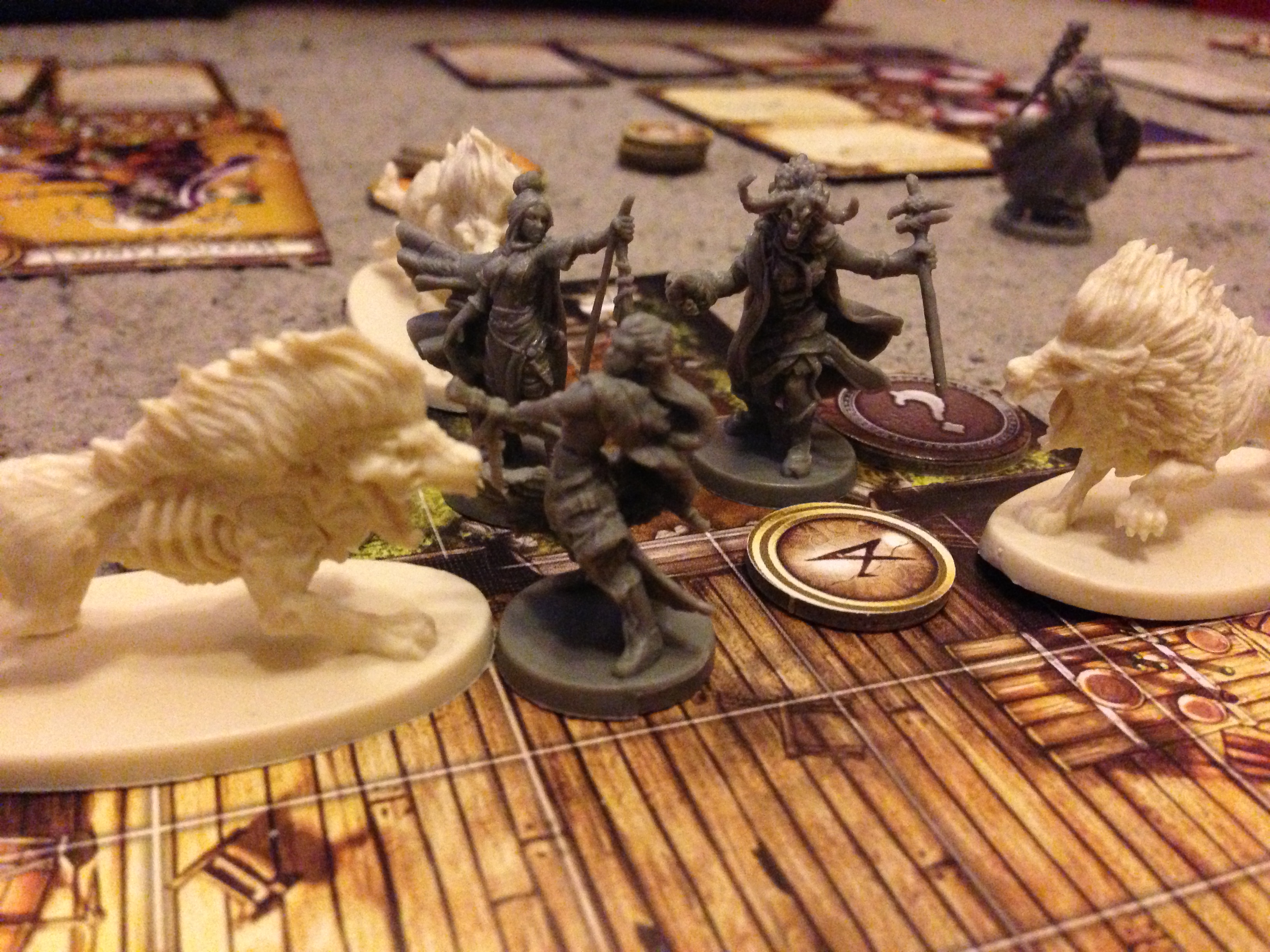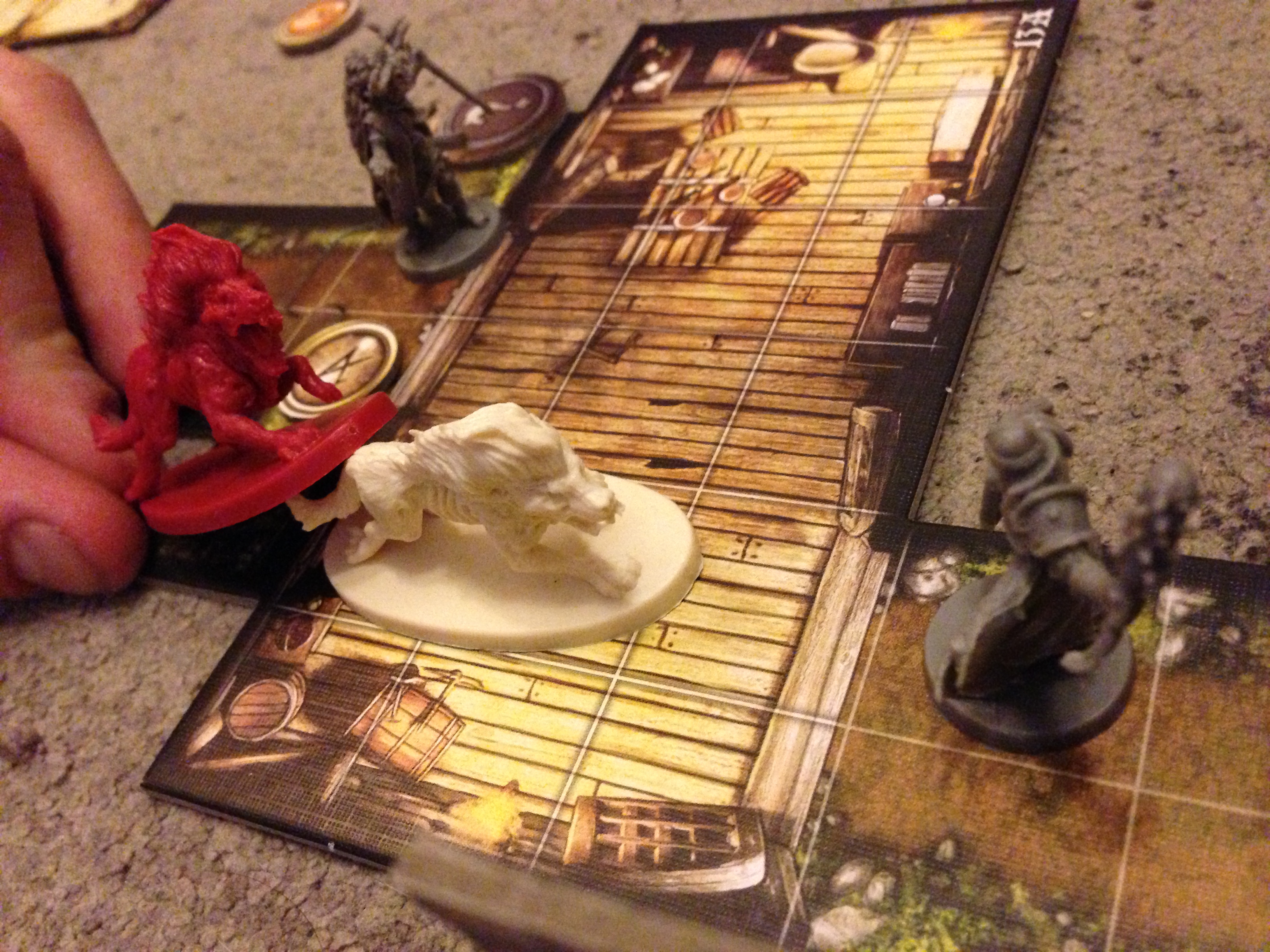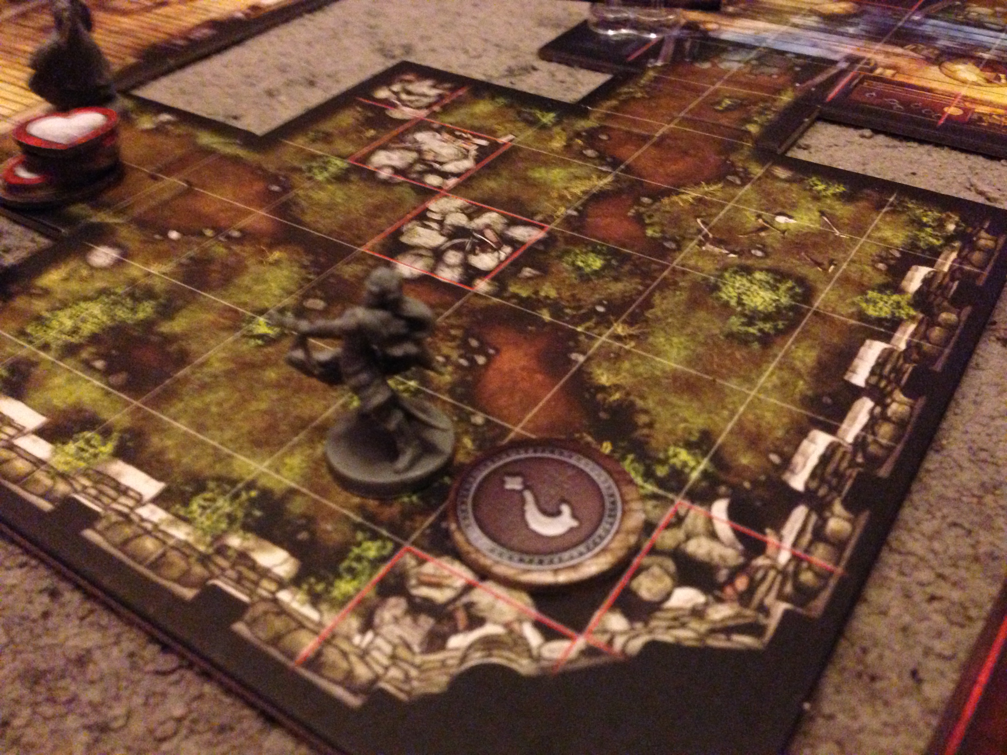 Round 1: The group rushes into the first room location on the map where they run into a waiting pack of barghest. A few well placed attacks later and they manage to take down one of the attacking barghest and severely wound a few of the others. It’s Fi’s turn to move the villagers so she tries to move them further away from the current monster locations.