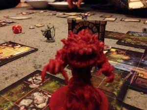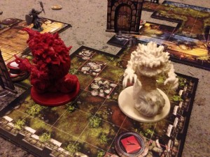 Round 2: Despite me spawning a new barghest behind the heroes, in one fell swoop they manage to clear the entire room in a mix of failed defence die and some great skill usage from the Paladin’s beatstick. They even manage to light one of the bonfires. With little to do I spawn a new monster behind them and get to work with the elementals. Comboing with 4 of the Overlord’s event cards, I succeed in moving through half the map and taking down 2 of the villagers with another severely wounded. 2 down, 2 to go.
