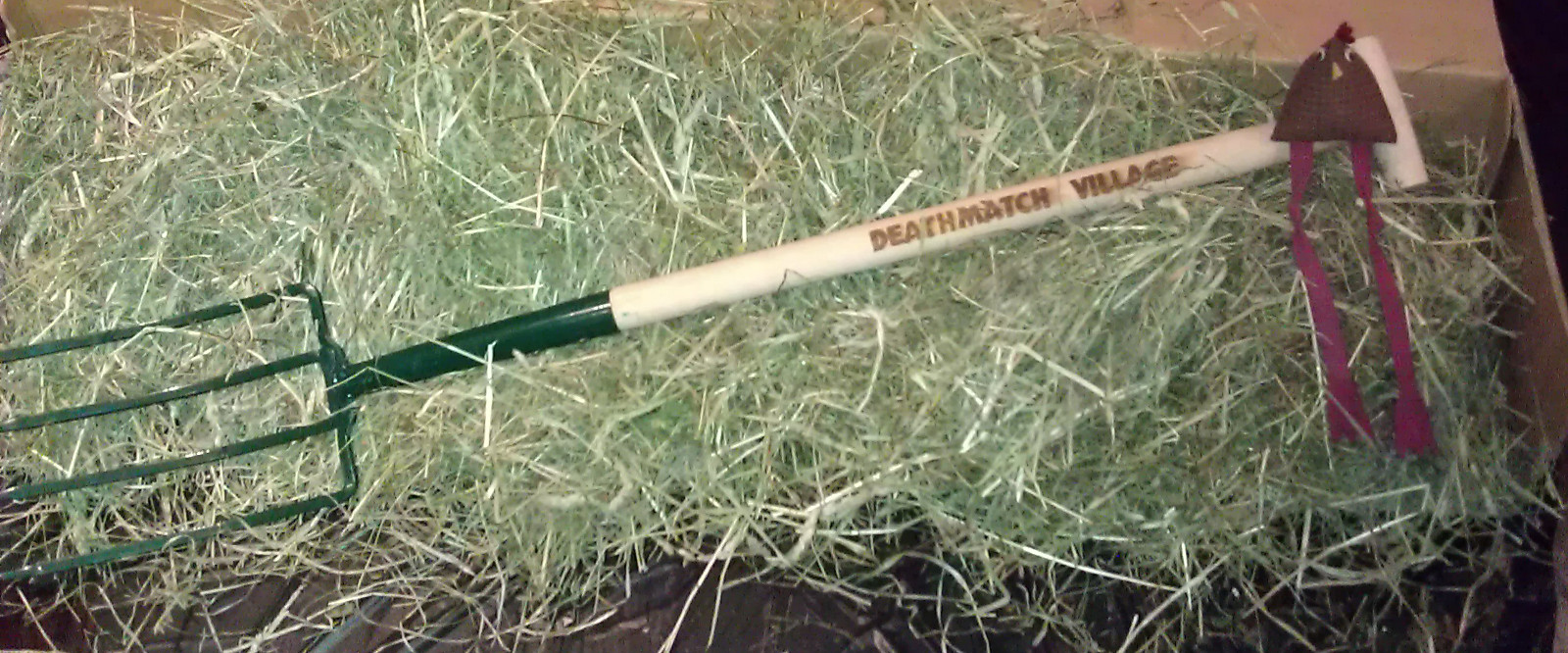 Players will wield dozens of melee and ranged weapons during fast-paced battles in a 3-on-3 arena. I can almost guarantee that one of the arenas will be on a farm and one of the melee weapons will be a pitchfork, because… well, they sent me a pitchfork. And some hay. In the post.
