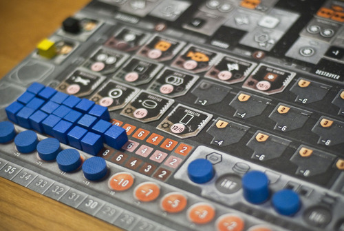 This shot from Board Game Geek shows off a section of a player sheet with influence track at the bottom, materials to the left and actions on the right. In this case he’d lose 10 money at the end of this round.