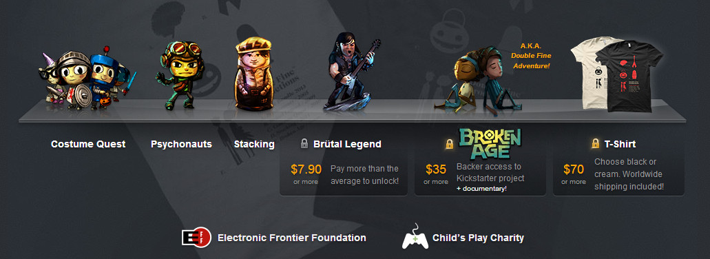All buyers will get Costume Quest, Psychonauts and Stacking, as well as the Psychonauts soundtrack. Pay over the average price (currently $7.90) and you’ll also get Brütal Legend and its soundtrack. Bump your payment up to $35 and you get a digital copy of Broken Age, formerly known as Double Fine Adventure and also the reason why everyone and their game-developing dog is on Kickstarter these days.