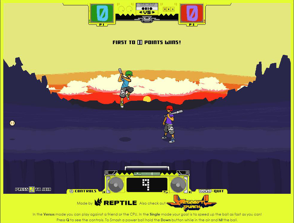 You control one of two dudes holding baseball bats. There’s a baseball in the middle of the map. If you hit the baseball with your bat it’ll travel faster in the opposite direction. If you’re hit by the ball you lose a round. First player to 11 rounds wins.
