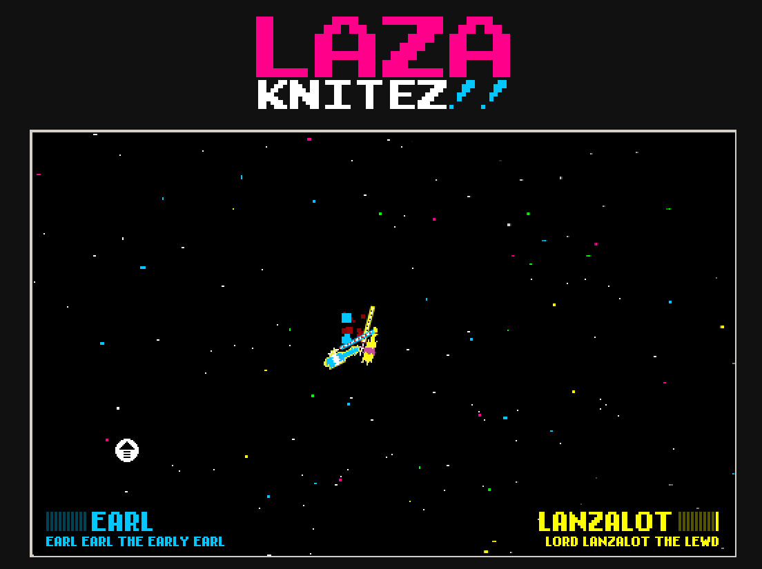 Still, LAZA KNITEZ!! is a 4-player game of Asteroids but without the titular Asteroids. I guess the other players are the Asteroids. They don’t break apart into smaller players when they’re hit, they just die, so it goes.