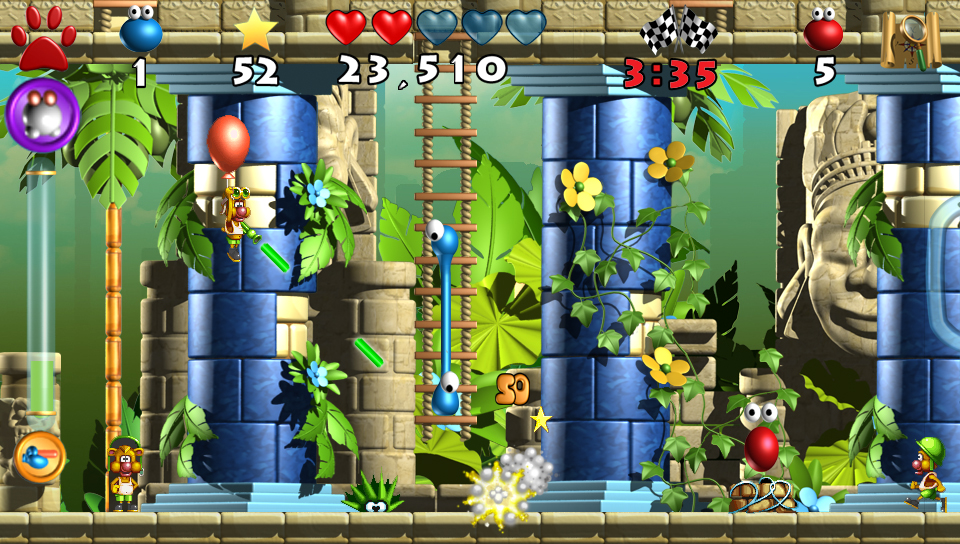 Putty has access to a host of weapons and items – nitro for the better-armoured enemies, a small rocket pod, a disguise so other creatures don’t recognise you, spring-loaded platforms to reach higher levels and more. You’ll also find items hidden in blocks around the map.