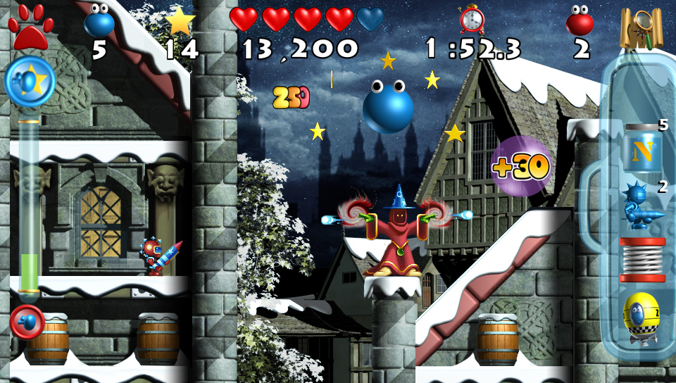 As you might expect, Putty is a malleable sort of character. He’ll happily bobble along, rolling across the screen, and stretching across gaps to reach distant platforms, climb ladders or otherwise manoeuvre his way around the maps. You can inflate him to grab floating stars, lie flat to avoid incoming missiles and form fists to punch his way through enemies.