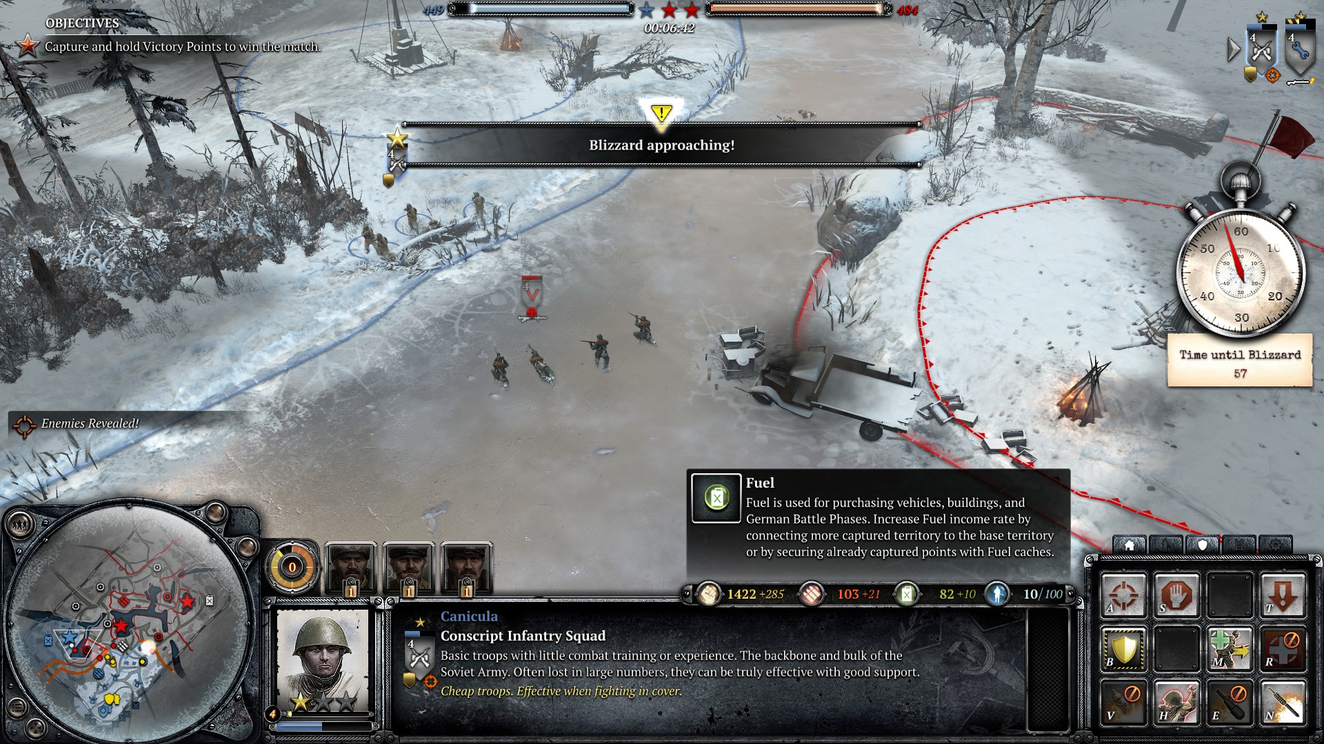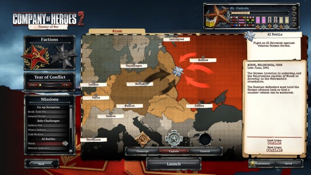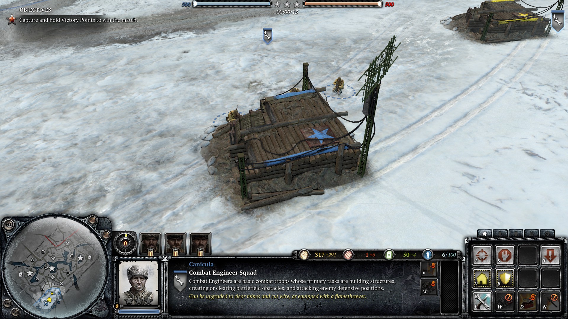 CoH2 does have another single player game, called Theater of War. This is where I found the game became more free-form and just a bit more fun. Several players or AI generals command each side in a capture-the-flag, resource control game. The scenarios begin with you starting with minimal units and having to manufacture most of a base, create troops and send out those units to control various strong points and flags.