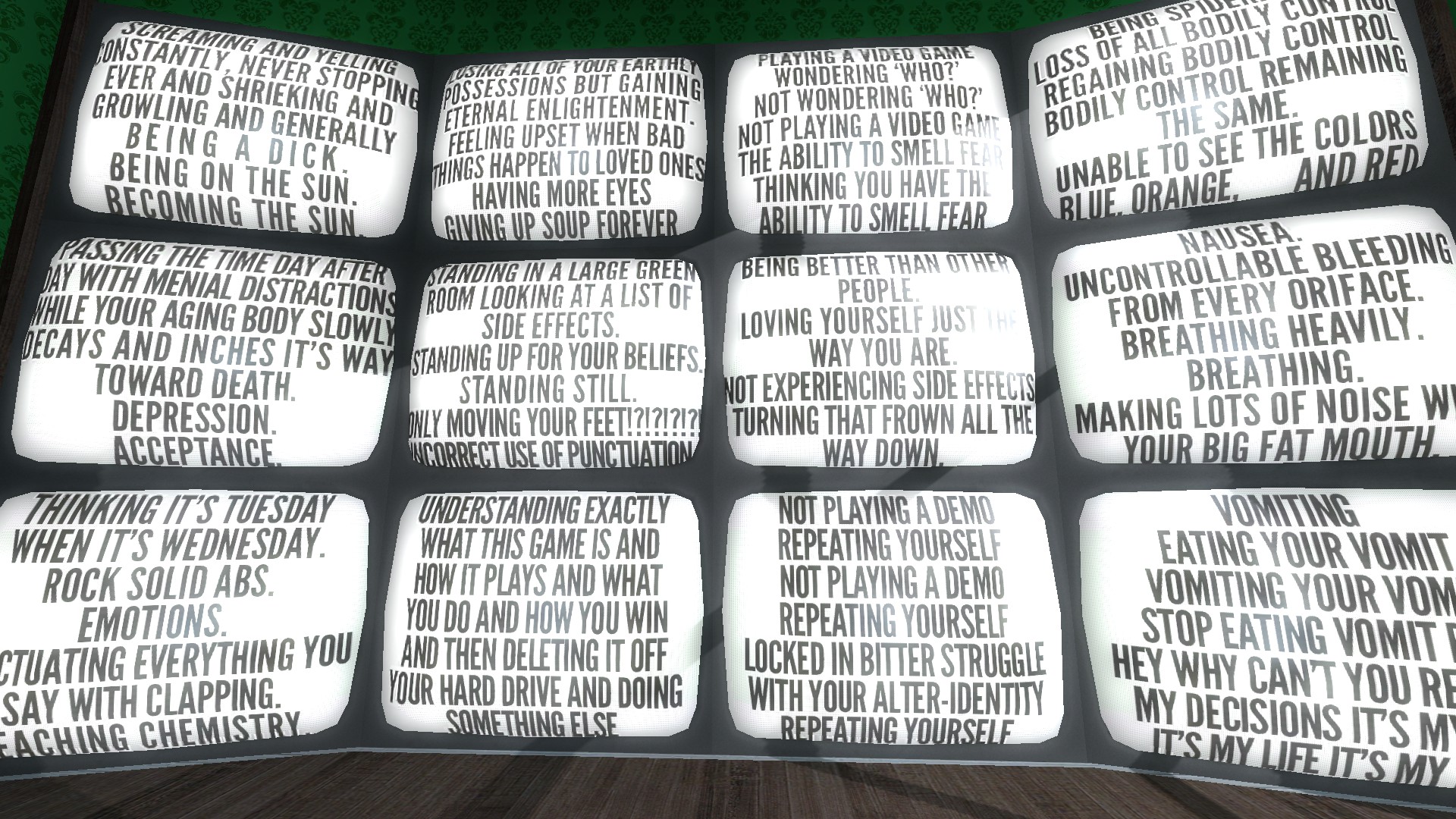 In the same way that The Stanley Parable promises to be a game about games, The Stanley Parable is a demo about demos, which is a trite thing to spit out and I’m genuinely (flagellatory) sorry but that doesn’t stop it being true. There’s a note you can find in the demo creation facility, it’s on some crates as you walk out of the emotion booth room. It lists a bunch of key rules that a demo should stick to in order to be compelling, all of which would be true for most other games, but this demo decides to totally disregard them.