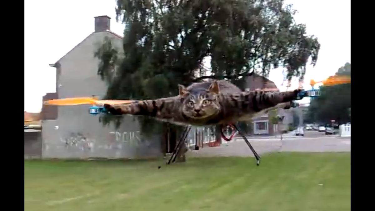 The quadrocopter cat: It’s called the Orvillecopter. Poor Orville was apparently hit by a car and his owner, Bart Jansen fashioned him into a quadrocopter. Here he is in full flight.