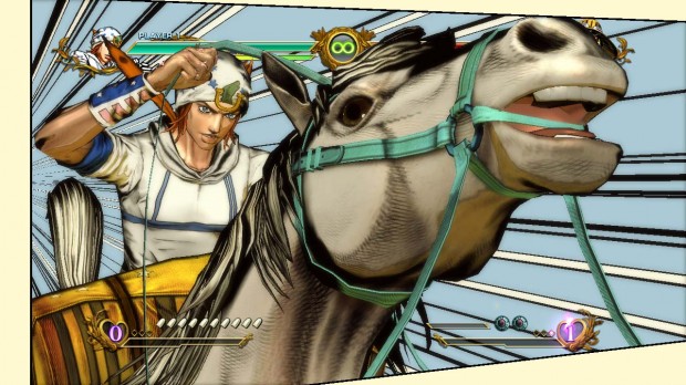There are five different ‘styles’ that characters use in JoJo, each one more flamboyant and downright mental than the last, from comically-extending limbs to fighting on horseback. Yes, horseback. There is little to the imagination in JoJo world; a world of adventure, fantasy, over the top dramatics, and quite frankly insane characters. Pacing is of a slightly slower nature, a la BlazBlue, and each stage has its own obstacles littered around, such as chandeliers falling from the ceiling, frog rain, all triggered by the actions of the two characters duking it out.