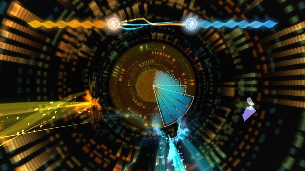 You play by controlling two separate entities with your analogue sticks – an orange fish squirms in your left hand while a blue bird soars in your right. They’re inexorably flying down a tunnel and you’re priming them to conjoin into a single green dragon.