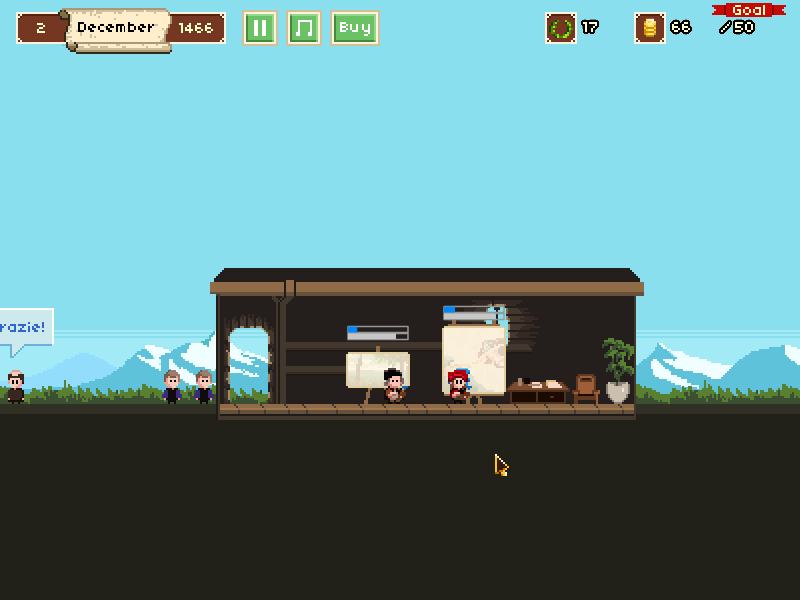 A patron will appear at your door with a commission. Taking on the work will create an immediate ticking clock (not literally because, like, it’s the mid-1400s and that’d be pretty unlikely). Da Vinci and Verrocchio work on art to the best of their ability but need to take regular rest breaks. Sometimes you’ll have more than one canvas to complete. You’re usually always against a pretty tight deadline. As an older man, Verrocchio benefits little from studying, but Da Vinci is a fast learner and a genius and can soon outpace his tutor in skill, assuming he’s given enough space away from bringing in enough florins to hit the books.