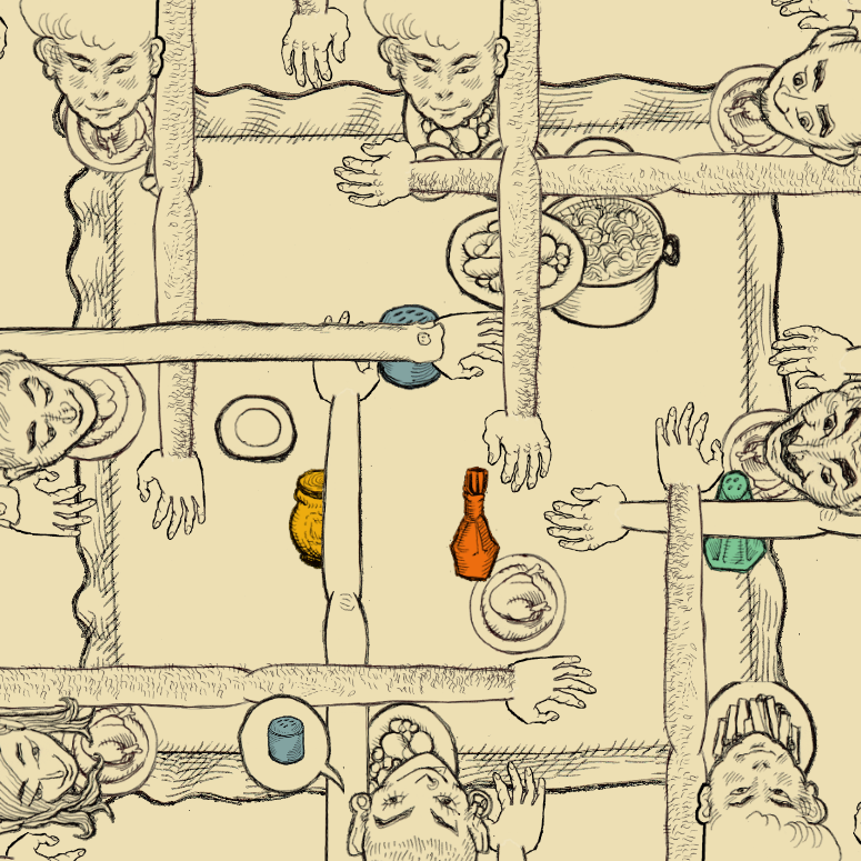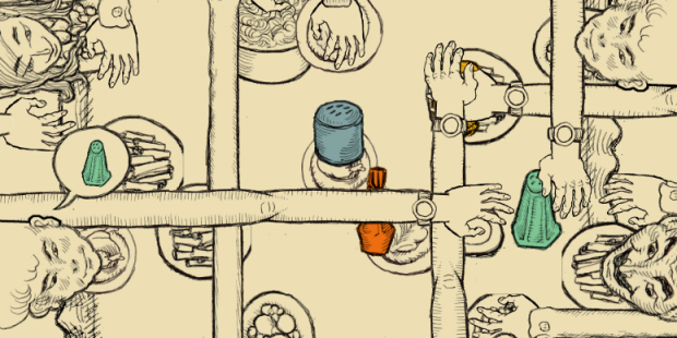 Everyone at the table has a massive arm that can be extended forward or backward based on movement of the mouse. They huddle around a square table and as the mouse moves it controls the hands of everyone at once. Clicking will cause everyone’s hands to grasp. Someone around the table will ask for the blue shaker of salt (or another item entirely later on) and so it’s your job to navigate the mess of writhing hands and get it over to them in increasingly obfuscated paths.