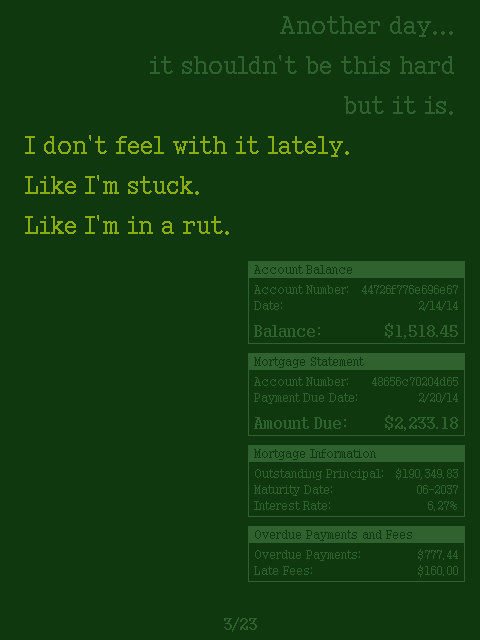 I’m pounding away at a ridiculous mug of coffee in order to write this. I’m exhausted from nearly a week without a break from my day job and I’ve still got another 7 days before I’m taking any real time off. That’s the perfect mindframe to talk about Flapping Bird, a game about the diminishing enjoyment gained from a career-focused existence from a protagonist who’s reached middle-age and feels like all they’re doing in life is chipping away at mortgage debt. Yippee.