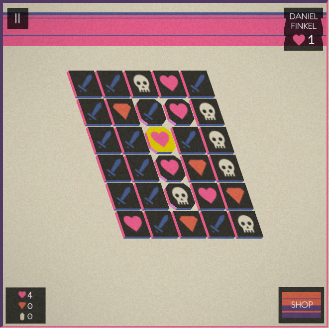 The clutter, instead, is the jewels, which can be used to buy items from an in-game shop and interestingly, you pick up as many jewels as you’ve selected when the game randomly picks one of them as your action. Spend your entire turn picking five jewels and you’ll get them all. Pick just one and if that’s what luck draws then that’s the only jewel you’ll get. But picking them up means you’ve neither dealt damage or healed up by selecting a heart instead. Plus you’ve probably opened up the board better for the other player’s turn.
