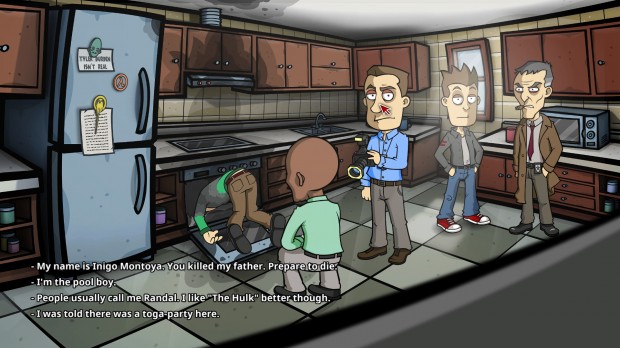 It all starts out wonderfully. Randal and his chums are sat in a bar discussing his best friend”s forthcoming engagement celebrations. The dialogue is funny if slightly dark-humoured and stylistically, the game resembles adult cartoons (not *that* kind of adult cartoon).
