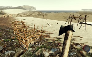Campfires will stave off the cold and roast small animals, though there’s no way to store cooked food. Eat it fresh off the fire or let it burn away. Drying racks will store loads of lizard and rabbit corpses for you eat as and when required. The one time I successfully managed to clock a deer on the head with my axe, the meat simply vanished from the drying rack, so the forest economy is still pretty limited. I’ve been told that the smell of drying meat will draw the cannibals. This seems true but from my experience they would much rather risk their lives for fresh man-meat than eat my filthy dried lizards.