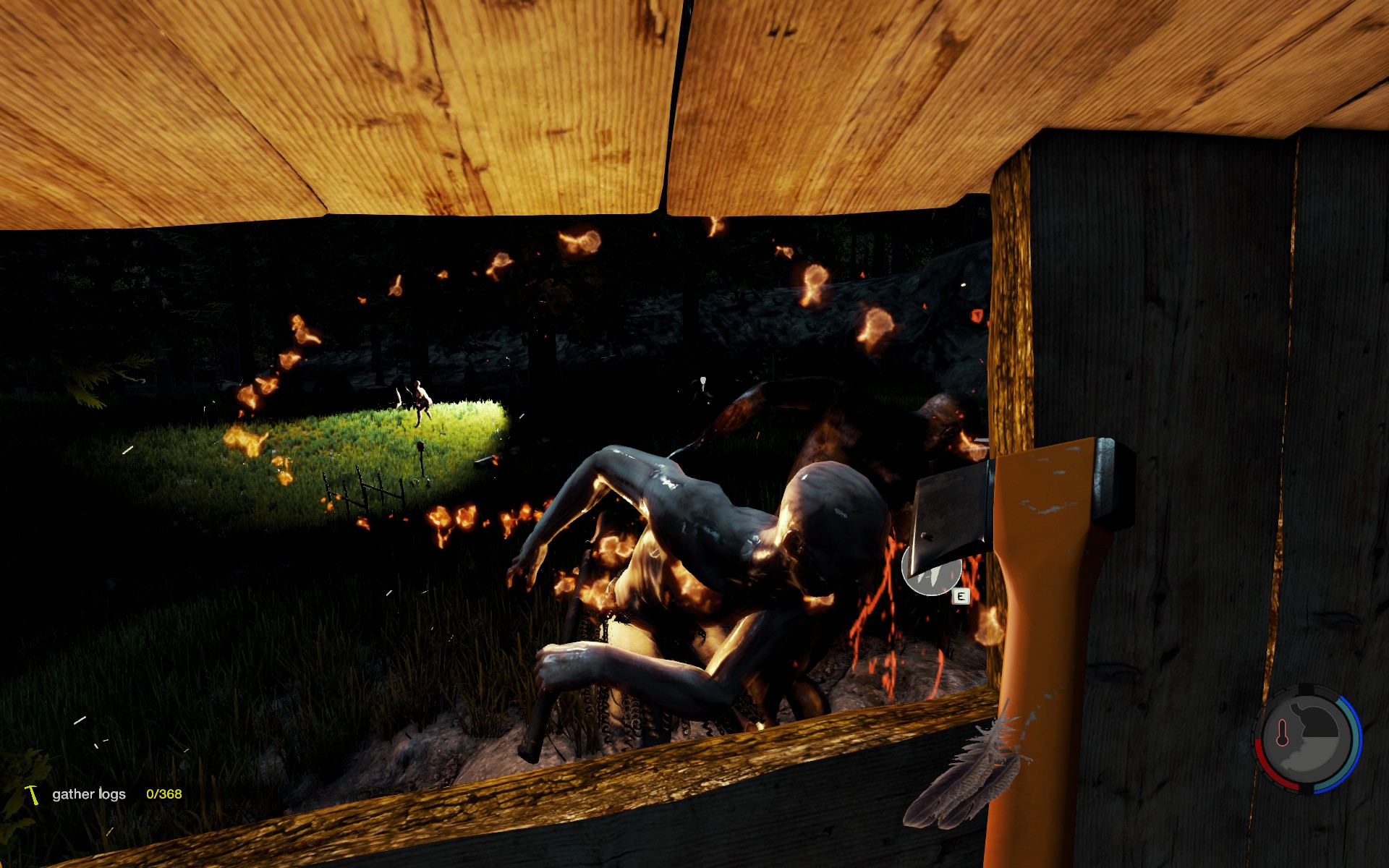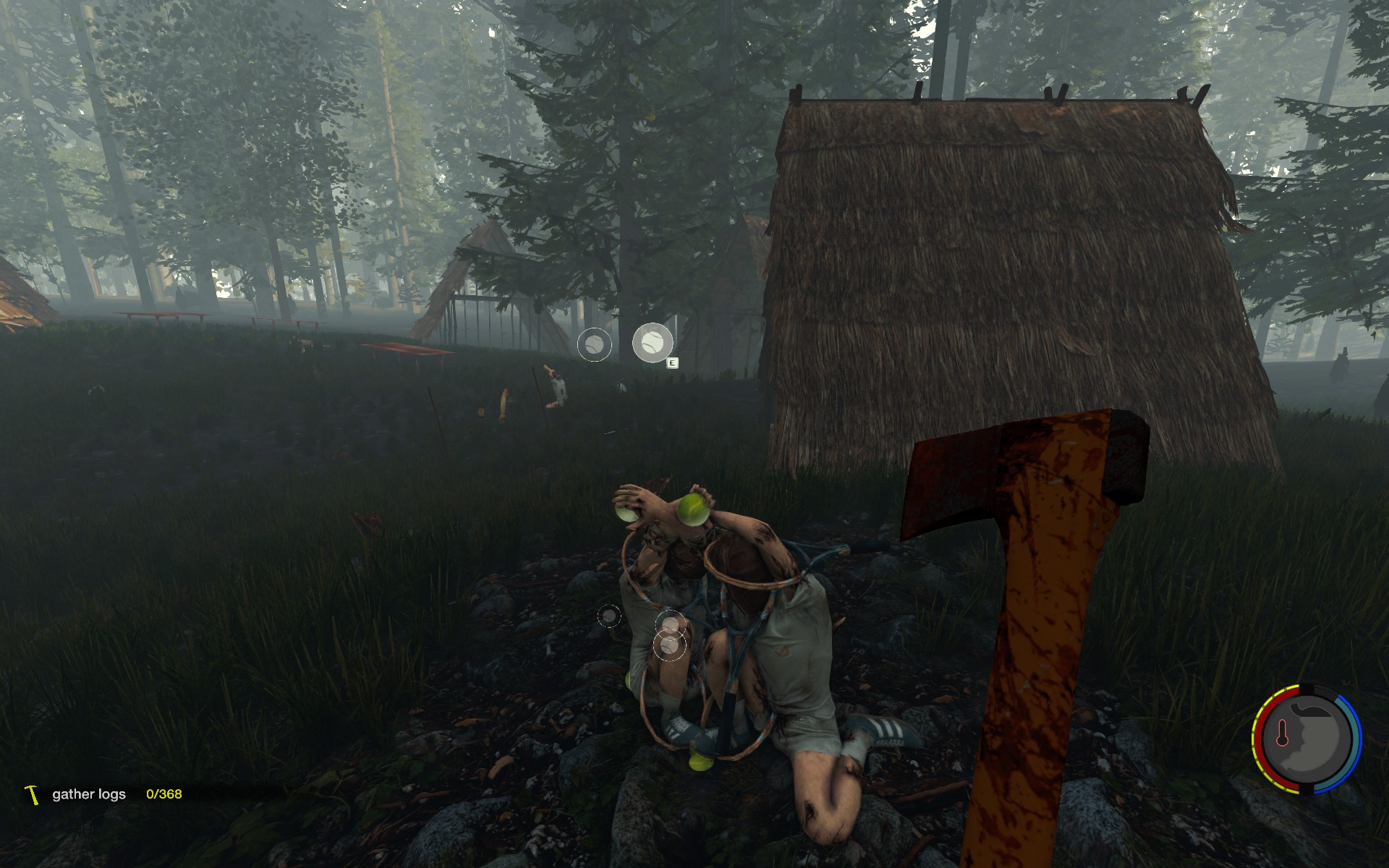 That’s not the weirdest part though. It gets really weird when you’re under attack. Cannibal homes are simply large triangular huts to keep the rain away, so they’re not big on doors. Any kind of cabin will keep them at bay, at least until someone glitches through the wall or you leave the unsecured door open wide enough for them to brave the demon’s portal.