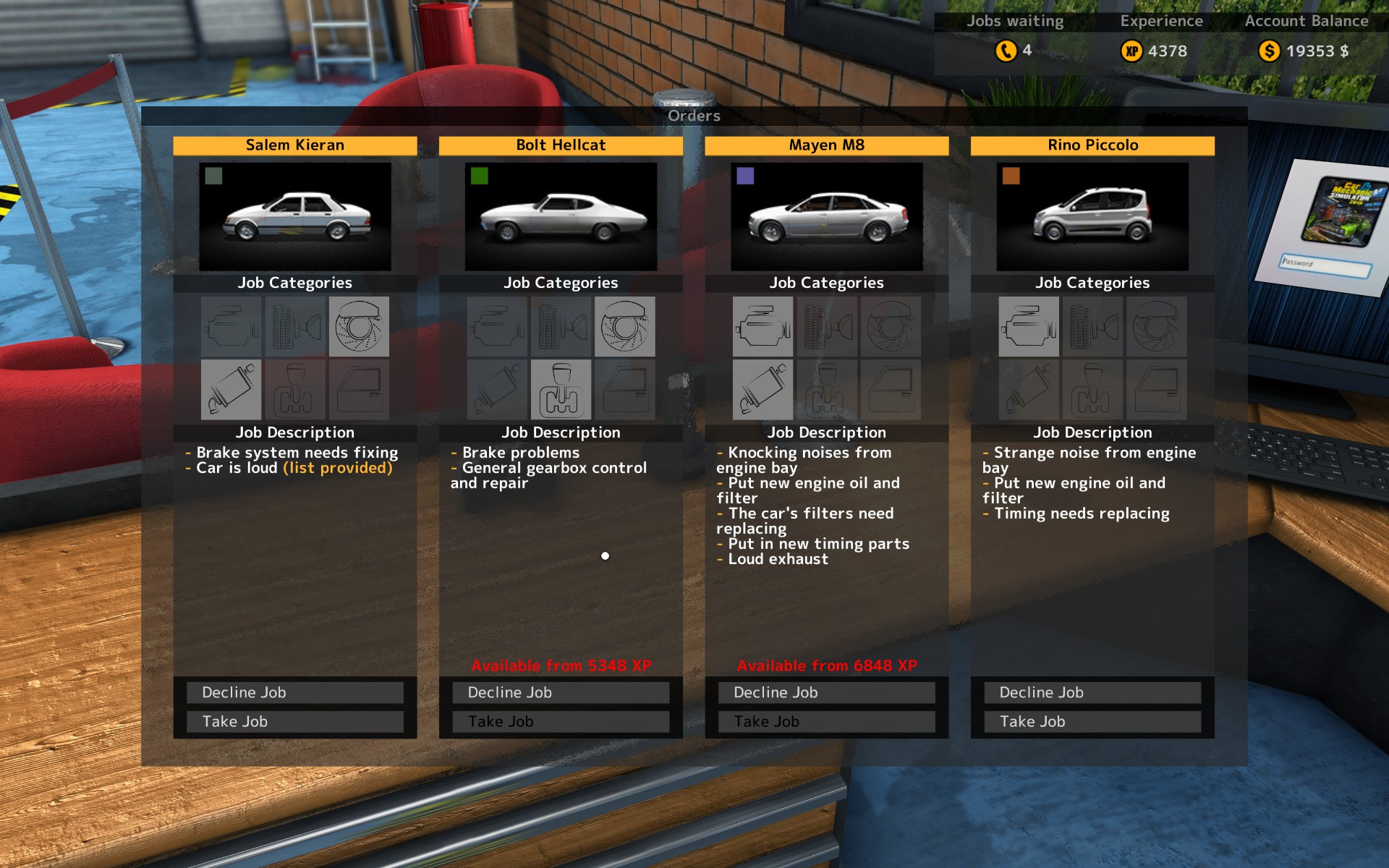 You do have to be an ethical mechanic – there’s no dodgy meta-game here. It won’t let you steal good parts from cars and replace them with broken ones, nor can you “accidentally” leave out the air filter to bring the customer back for a second job. You can swap out great parts for slightly ropey ones if you’re so inclined, but since each job has a minimum quality threshold for parts, it won’t really save you much money. That said, once you gain a few levels, you can unlock repair tools to fix up broken parts, so the more valuable components could be worth hanging on to.
