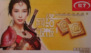 Quite what “internet snack” actually means I don’t know. The perfect gamer snack, maybe? Wouldn’t World of Snackcraft been a more apt title given the outfit the woman is wearing on the packets cover? Oh wait, look each biscuit has an “@” symbol on them…ahhhh it’s all clear now. Very funny. Not.