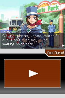 The other big change in Apollo Justice was Perception (for want of a better thing to call it). In Bracelet Perception Mode (don’t ask) you can scrutinise the witness’s body language and looks for a “tell” to indicate that they’re lying. This was almost fun but for the fact that you could only look at a tiny part of the witness at a time. Allowing me to zoom out for less detail would have been less frustrating as each character had roughly five testimony statements, three different “phases” to a statement where they could lie and four different body parts that could have a tell.