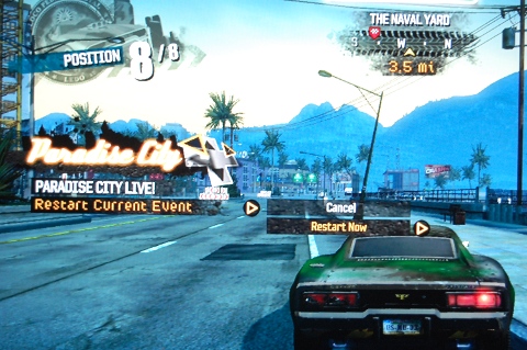 Also the restart option is only available during an event! When you fail an event the option disappears and pressing right on the d-pad opens up your freeburn online menu as it always has. If you want to restart the last event you can do this as well now. As before press right on the d-pad to open up the Paradise City Live! menu. You should now see the option “restart previous event.â€