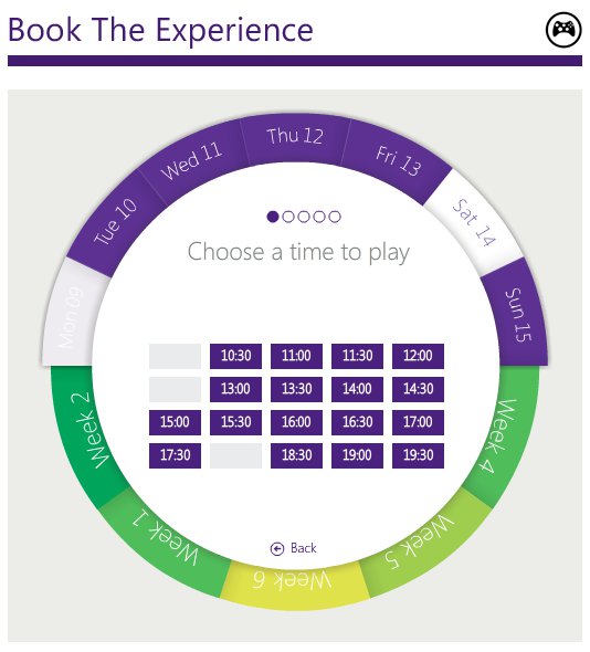 So wander over to the Kinect Facebook page and allow the application to access your schedule and info. You will then be able to book a session using a swish looking wheel: