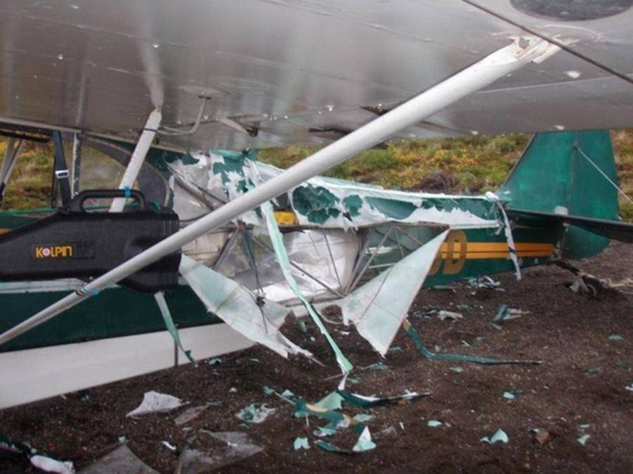 This aircraft was badly mauled by a bear (hunting for the food left inside). After using several crates of duct tape the pilot had fixed up the aircraft and flew it home. Yes, that’s right, flew it home.
