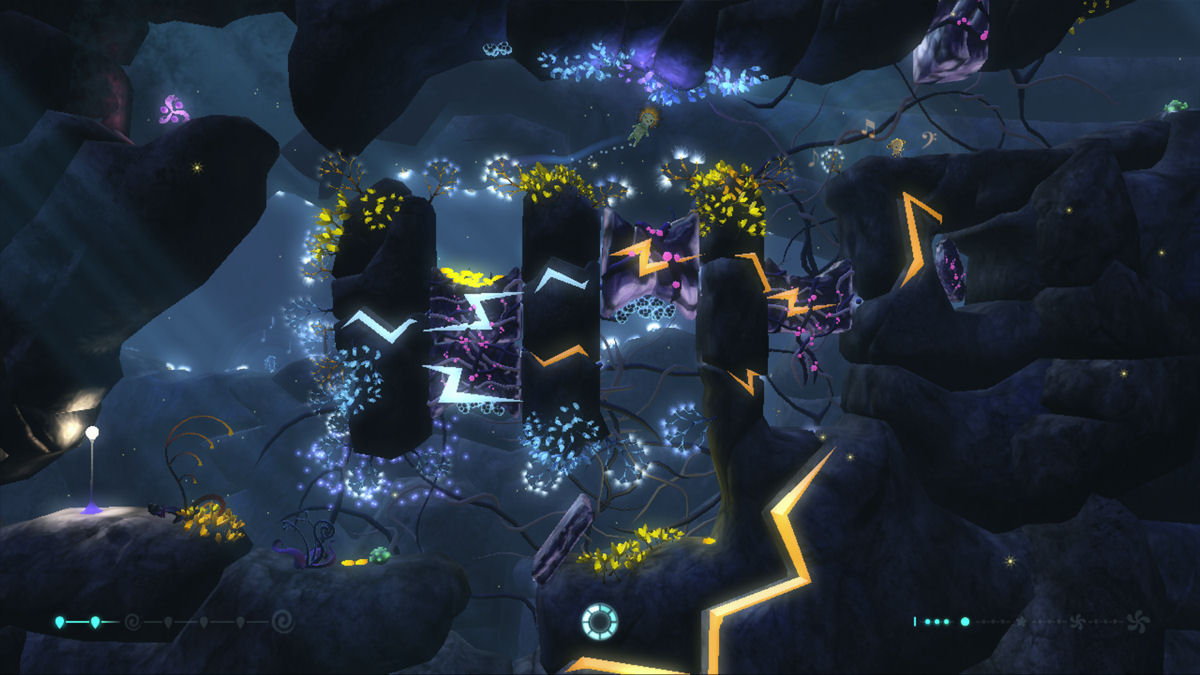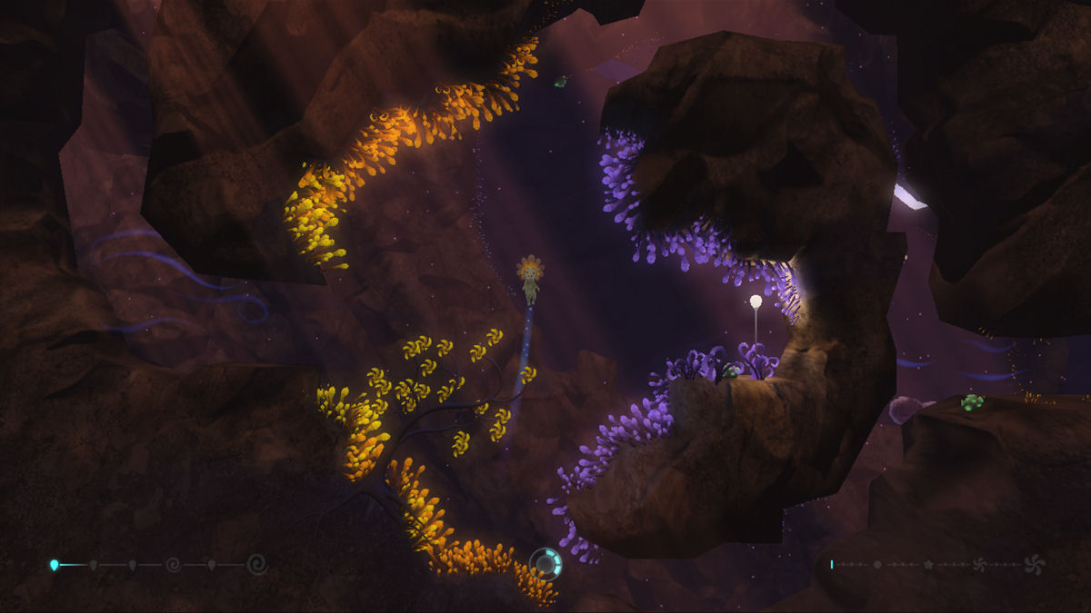 You are eased gently into the game play, learning how to navigate around the caves and what you need to do. Starting off you need to bounce off green pouch looking plants, gathering pollen to enable you to pollinate the nearby plants. This causes the flowers themselves to grow, lightening up the caves in different ways. Some of these will also bear fruit, allow you to interact with the environment.