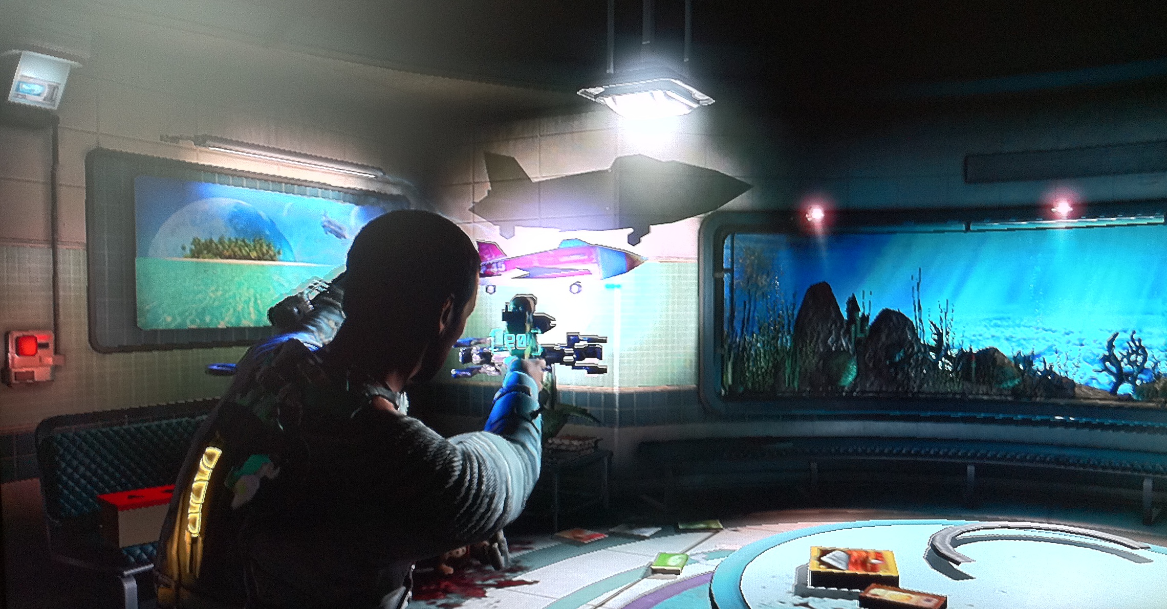 The setting of the game is now a giant complex called The Sprawl on the moon Titan. You find yourself battling Necromorphs in kitchens, bedrooms, children playground, shopping malls as well as airlocks, Solar Arrays and other spacey locations. This is real-world sci-fi. That is, environments that look familiar and aren’t too outlandish. Personally, I think this makes the game more unsettling as you can imagine yourself wandering around that shopping mall only to be attacked by hideous space monsters and god-awful advertising. Although, I do hope that when we do colonise other planets the technology doesn’t break as much as it does in this game.