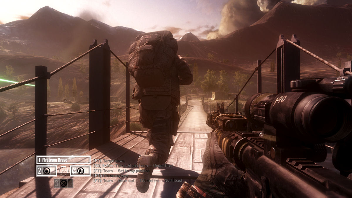The campaign follows Fireteam Bravo across several days of an ongoing mission. I played through the first 3 days covering basic training, clearing insurgents from a village, clearing insurgents from a farmhouse and clearing insurgents from a farming village. Yup, this is much more of a military sim than your average shooter. Mission repetition not as dull as it sounds – the range of weaponry you get to play with keeps things fresh and some tremendous sound engineering makes for a truly awesome experience on missions like calling in your first mortar strike.