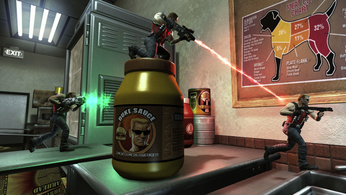 The final mode available was a more typical deathmatch with guns but a rather unusual setting. Lots of mini-Dukes blasted their way around kitchen counters, reminding me of that classic racer, Micro Machines. I didn’t play this myself; again, we saw 8 Dukes charging at each other across a map filled with themed environmental hazards like giant hot griddle plates. Look at Spong’s multiplayer preview for more info on this.