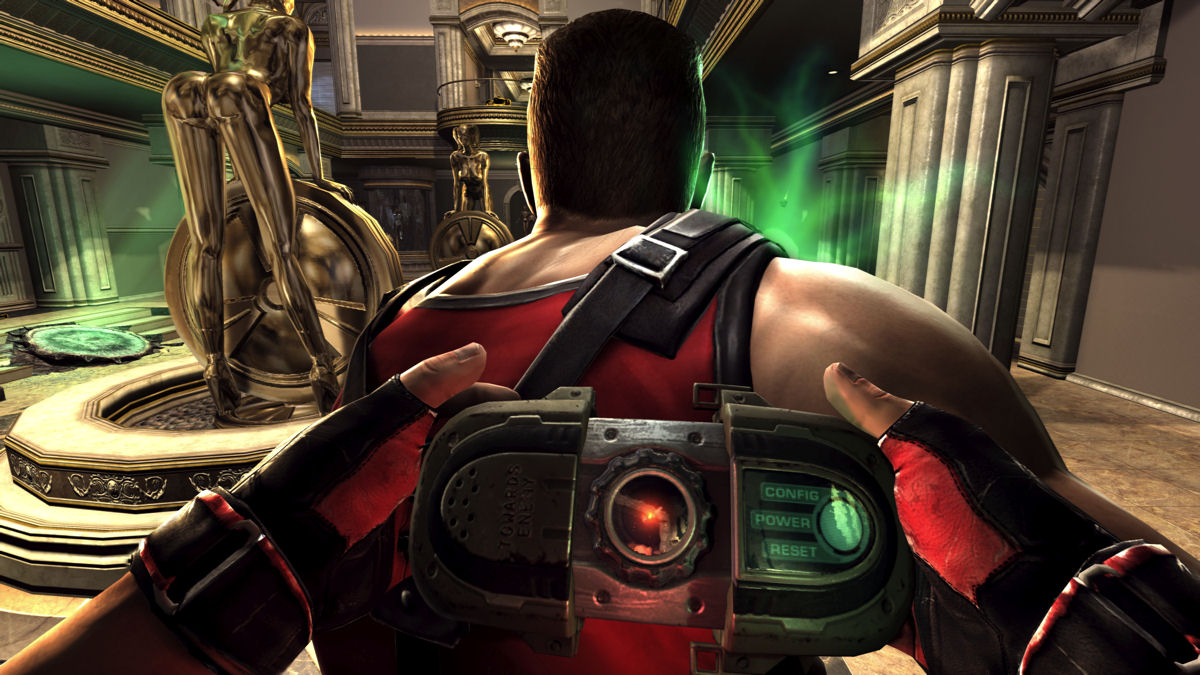 Given that all the multiplayer avatars are Duke, you’d expect things to look boring pretty quickly, wouldn’t you. Not so! Customisation is the buzzword of the year with Brink claiming to have over 100 quadrillion unique character models (none of them female) and Rod Fergusson talking about pink guns. As you play through Duke Nukem Forever’s multiplayer, you gain levels and unlock shirts, hairstyles, sunglasses and other cosmetic bits and bobs.