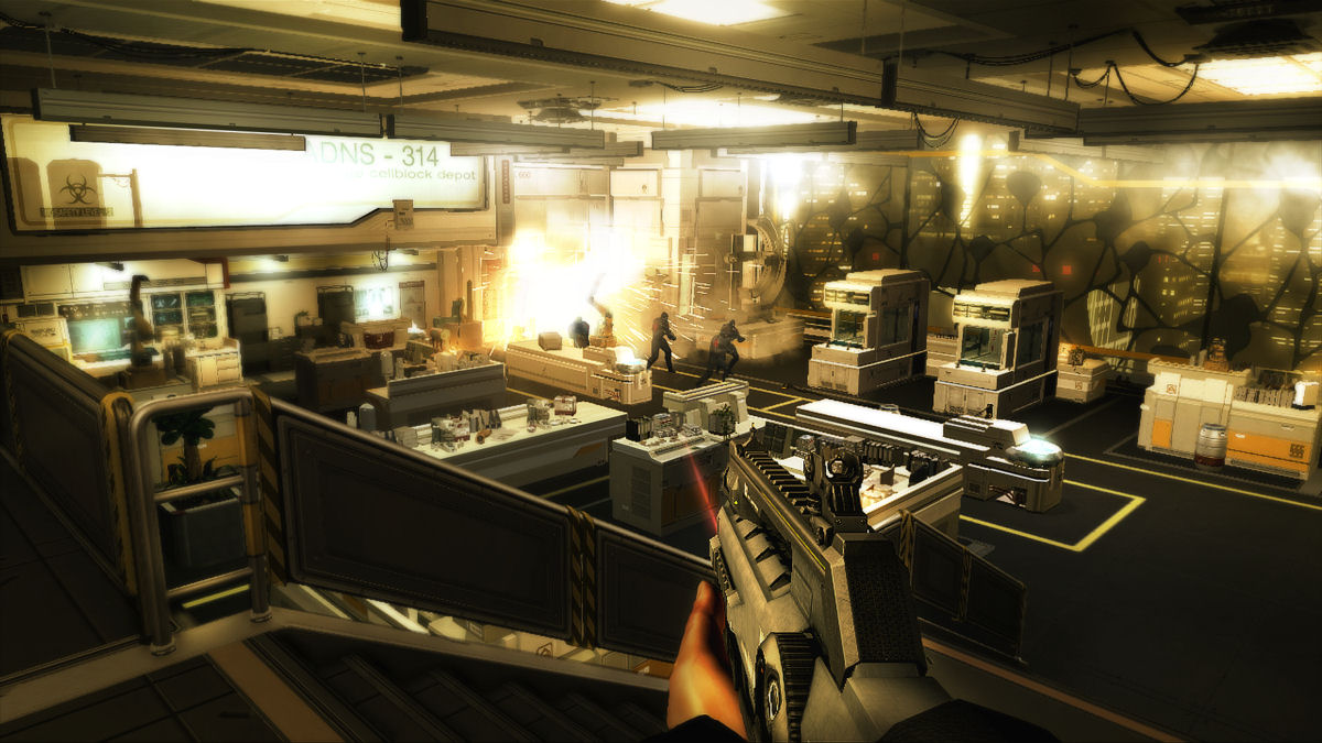 So what’s it all about? Well that I can’t go into much detail about, it would definitely ruin the game! Here’s what we can tell you. You play Adam Jensen, Head of Security for a US biotech firm called Sarif Industries. Usual run-of-the-mill role – you defend the trade secrets and make sure nothing bad happens. Sure enough, a bunch of black ops guys break in, trash the place to high heaven and kill a bunch of the staff. You get shot to shit and wake up having been modified with military-grade augments – mechanical enhancements to replace parts of your broken body. This is where the game really starts. You’re off to track down what on Earth is going on, and who’s doing it.
