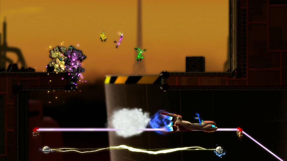 Mr and Ms. Splosion Man are, despite being different experiments, highly explosive. You need to ‘splode off a surface in place of a traditional jump. In turn, this allows you fling yourself from wall to wall until you reach your destination. Of course the ability to ‘splode infinitely would be too kind to the noble gamer attempting to master this title. Twisted Pixel has imposed a limit on ‘splodes; 3 in succession is all you get. After that you are forced to wait out a 3 second recharge or run through one of the many boost points scattered around.